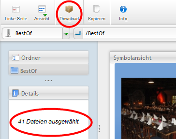 Wenn Ihr alle Bilder einer Kategorie herunterladen möchtet, könnt Ihr durch einen Klick das erste Bild der Kategorie markieren und dann bei gedrückter Umschalt-Taste auf das letzte Bild klicken. Die Bilder sollten dann alle blau unterlegt sein. Links seht Ihr die Anzahl markierter Bilder. Oben in der Icon-Leiste findet Ihr den Download-Button, um die ausgewählten Bilder in einer Zip-Datei herunterzuladen.